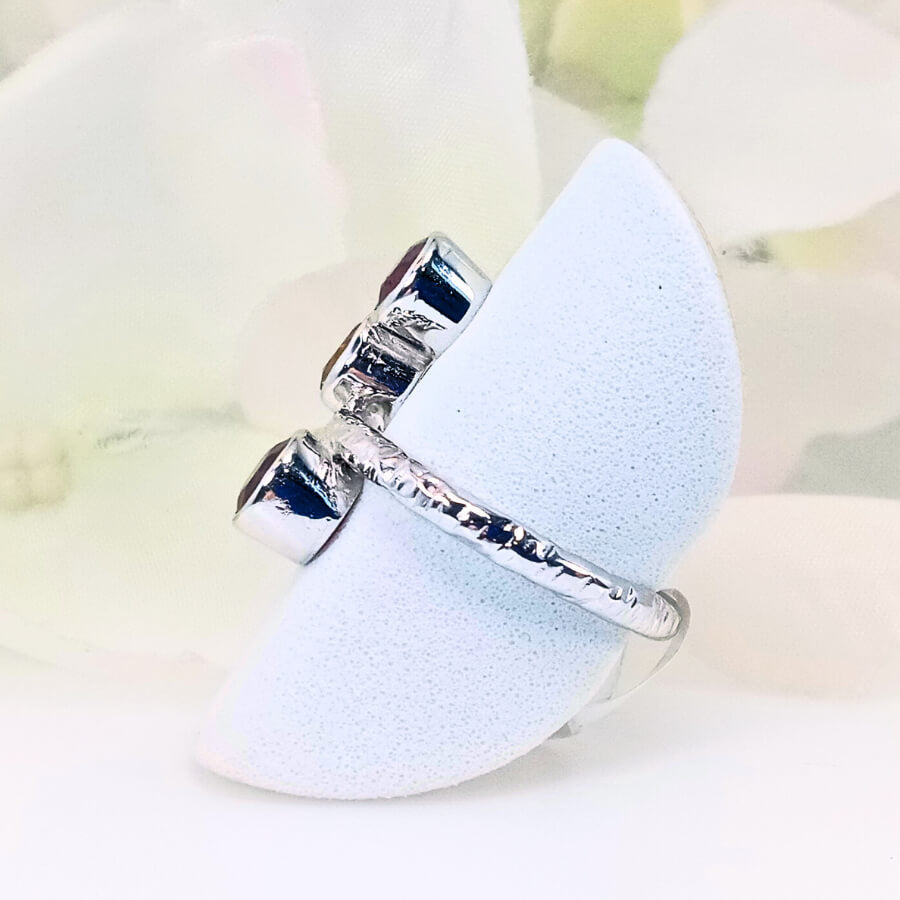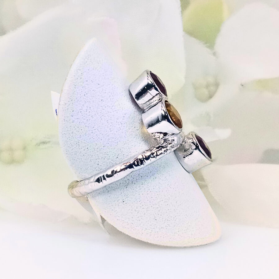 The Crimson Sunburst ring features two vibrant garnet gemstones and a glowing citrine in a radiant and fun design. Set in high-quality 925 sterling silver, this bold and energetic ring symbolizes passion, warmth, and positive energy. It’s ideal for those who are drawn to bold colors, radiance, and positive energy.
