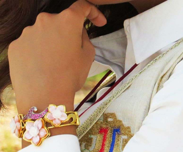 An Embellished Pink Mother Pearl Floral Bracelet made with Natural Ruby and Pearl. A Flawless Design with complete finishing.