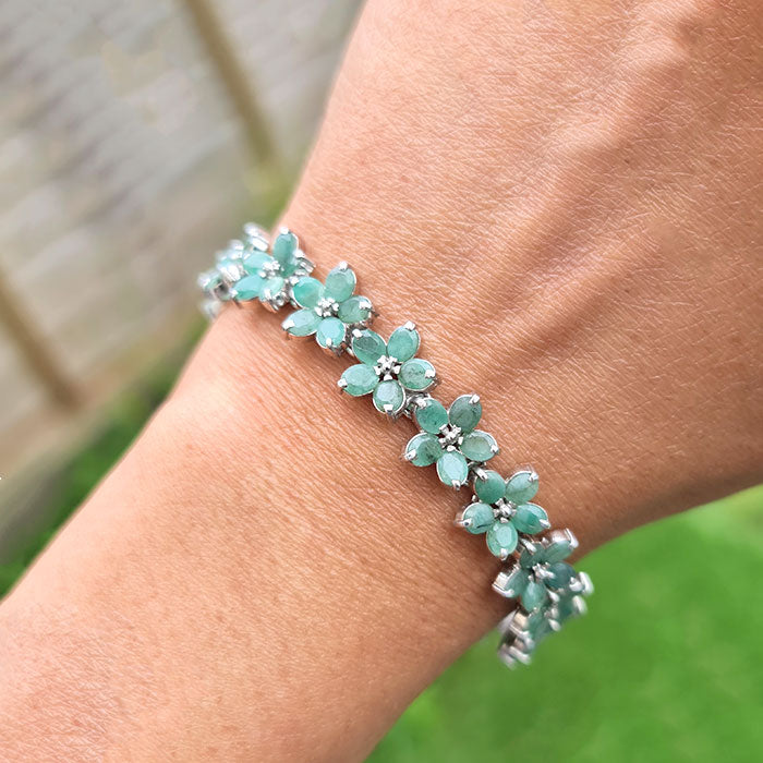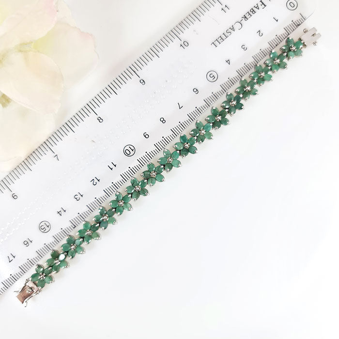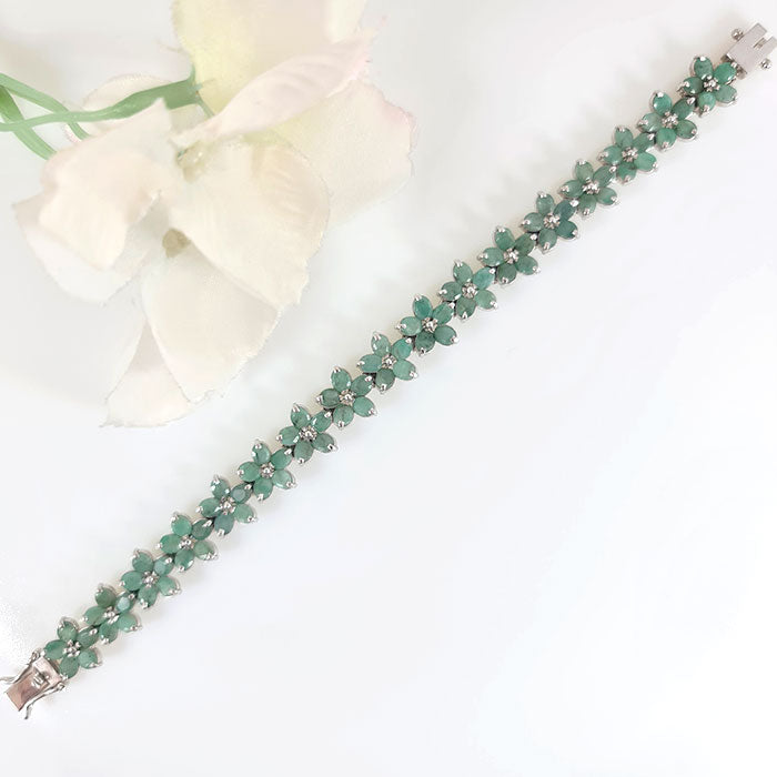 Imagine a bracelet where nature's beauty is captured in every detail—The Flower Emerald Bracelet in high quality silver. Each delicate link of this exquisite piece is adorned with emerald gemstones, reminiscent of lush green petals in full bloom. The emeralds, vibrant and rich in color, shimmer like morning dew on leaves, reflecting the sunlight with every movement.