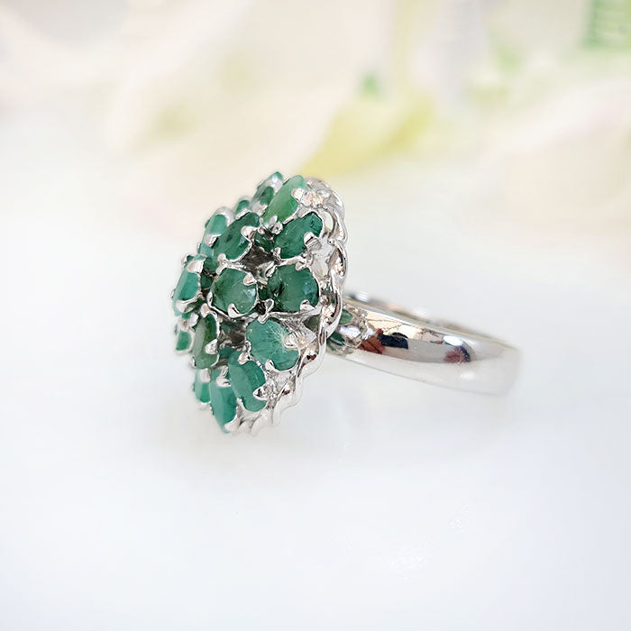 This ring features a mesmerizing emerald, renowned for its deep, lush green hue that symbolizes rebirth and vitality. The emerald is set within a meticulously crafted lotus blossom, whose petals gently cradle the gemstone, evoking a sense of purity and divine beauty. Each petal is carefully sculpted to create a lifelike representation of the lotus, with intricate detailing that enhances the natural allure of the emerald.