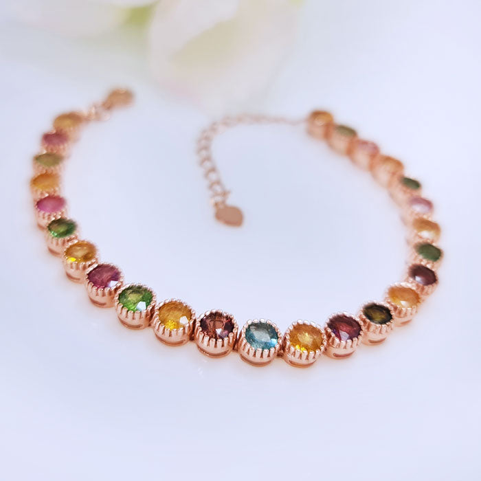 Ideal for both everyday wear and special occasions bracelet, this round gemstone such as tourmaline, peridot, garnet, and citrine adds a refined touch to any outfit. Its classic design makes it a versatile addition to your jewelry collection, suitable for layering or wearing alone.