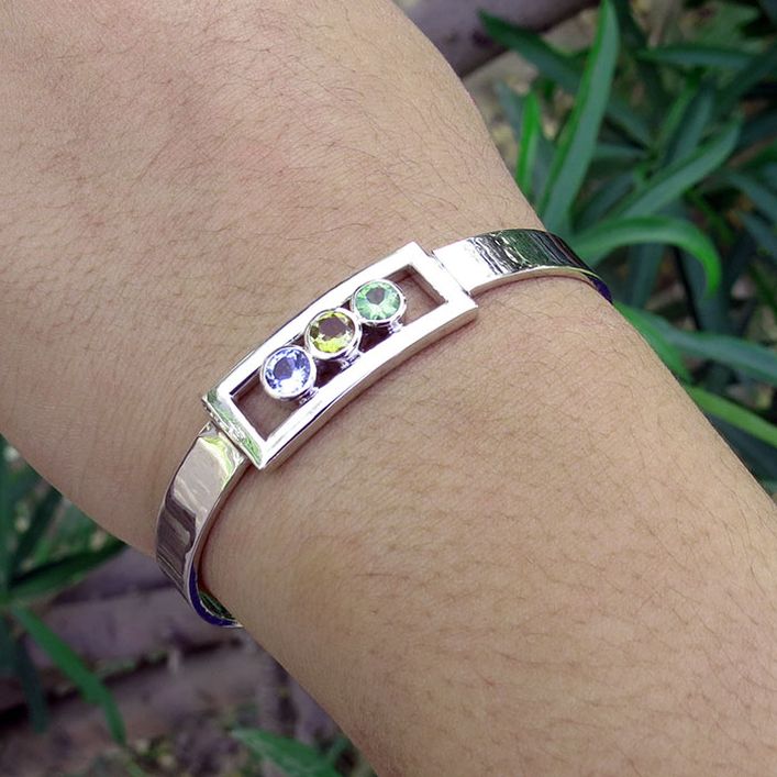 The three round gemstones are closely set next to each other in centre of a rectangular frame which connects the band all the around your wrist, but open from the back making it easy to wear. It is a part of our Birthstone Collection where we let you create your story, with those you celebrate the most in your life.