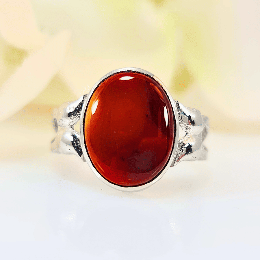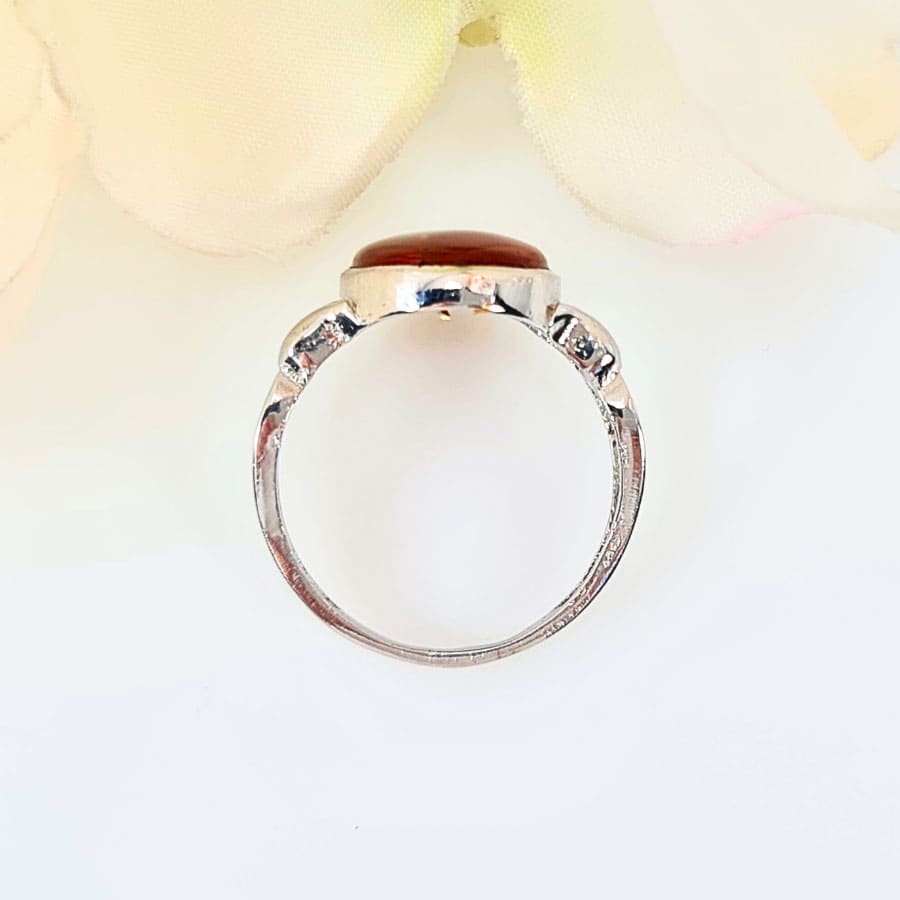 The Cinnamon Mirage Akeek ring showcases a captivating brown Agate gem, with rich, swirling tones of cinnamon and caramel that evoke the warmth of autumn leaves. The smooth, polished surface catches the light like the changing hues of the forest, creating a natural, earthy glow. On each side of the stone, delicate silver leaves reach outward, symbolizing growth and renewal, as if they were gently cradling the gem. This nature-inspired design, with its organic elegance, makes the ring a perfect tribute to the beauty of the natural world while also offering comfort.