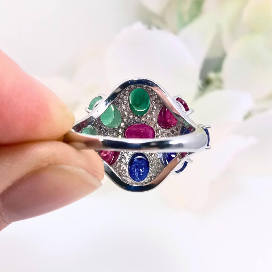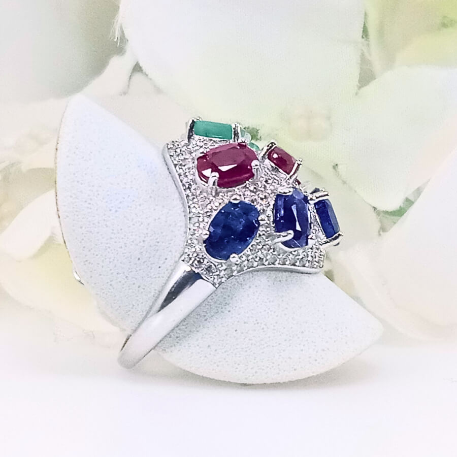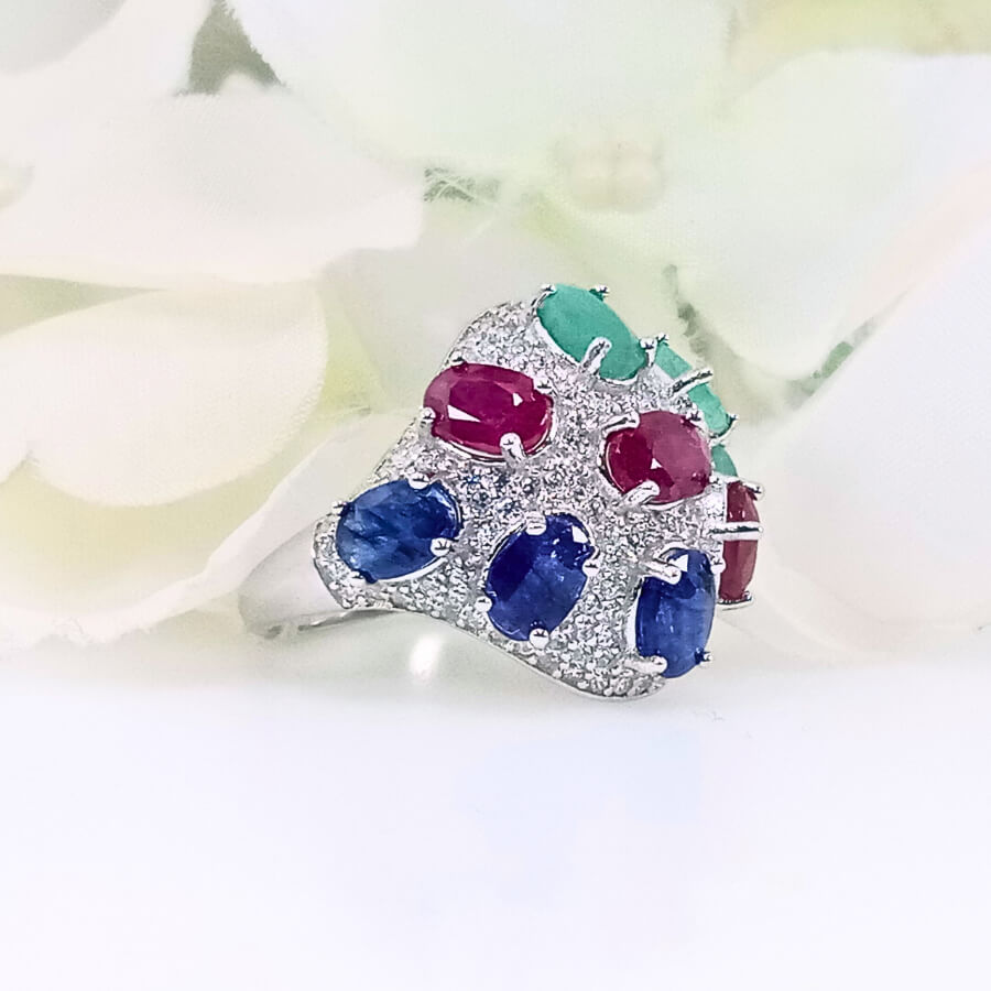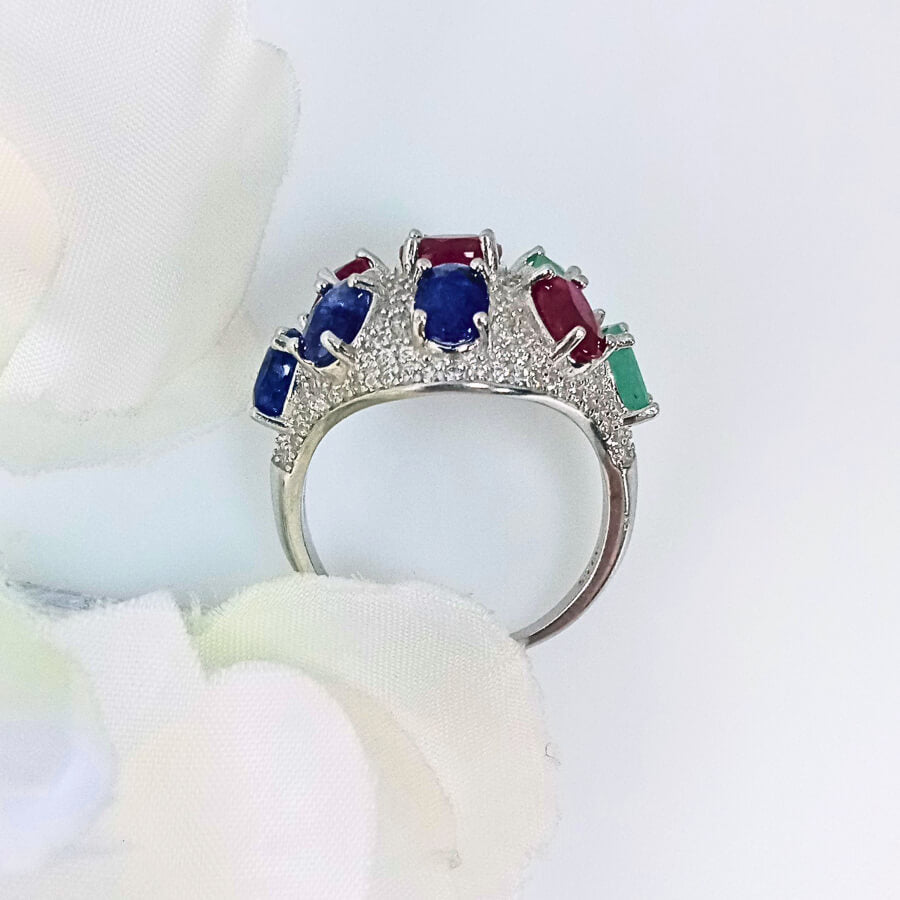 The Triad of Elegance ring showcases a stunning combination of sapphire, ruby, and emerald gems, each delicately crafted in a high-quality silver round design. The vibrant colors come together in a bold, eye-catching pattern that symbolizes wisdom, passion, and growth, making this ring a perfect piece of jewellery for any occasion.