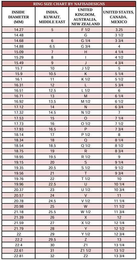 The chart below helps to convert the ring size according to the country. Please check your ring size before purchase. We use UK ring sizes in our online shop.
