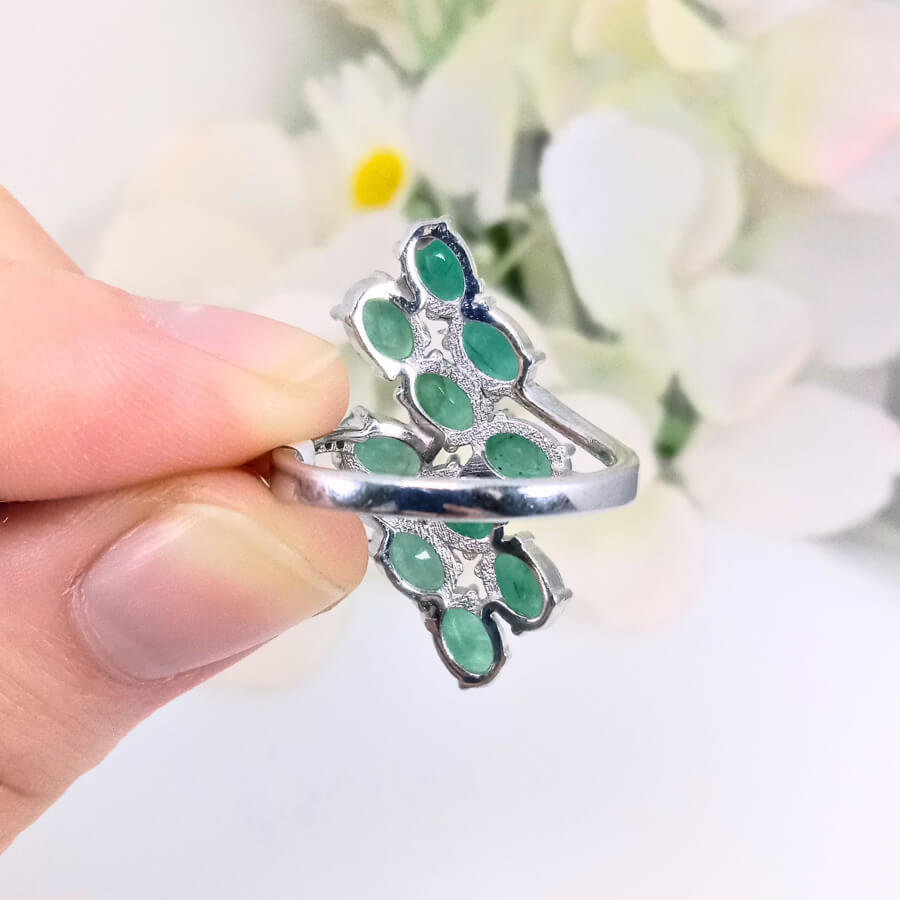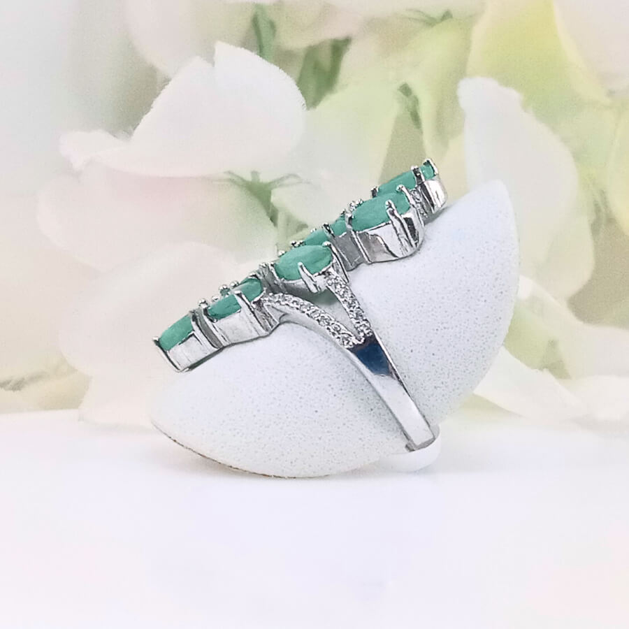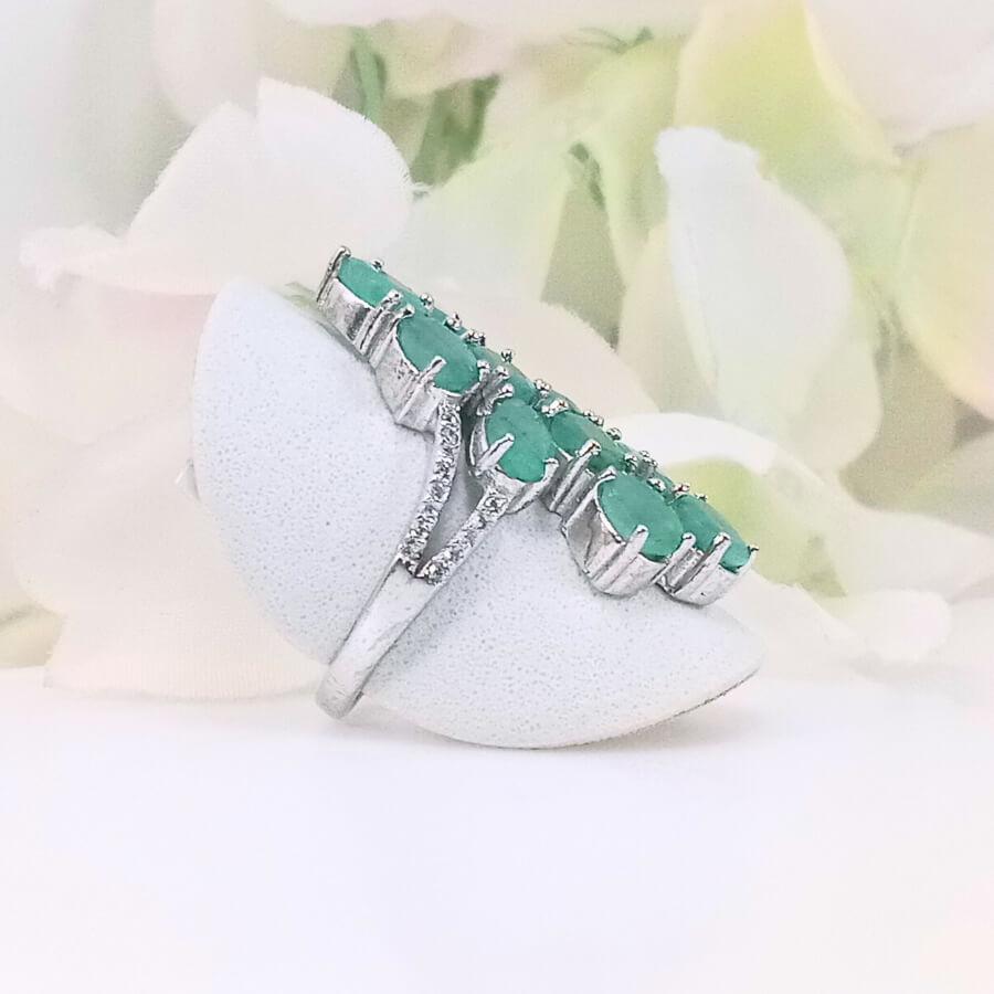 The Verdant Enlace ring features a stunning arrangement of small oval emerald gems set in a high-quality silver design. The vibrant green emeralds come together to create a bold, playful pattern, adding a touch of nature’s beauty and fun sophistication to any look.